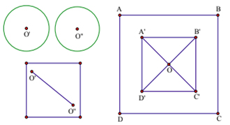 Các đường trung bình của hình vuông A’B’C’D’ chia hình vuông này thành 4 hình vuông nhỏ bằng nhau. Theo nguyên lí Dirichle tồn tại một hình vuông nhỏ chứa ít nhất 2 trong 5 tâm của các hình tròn nói trên, chẳng hạn đó là O’ và O’’. Do 5 hình tròn này không có hai hình tròn nào có điểm trong chung nên O’O’’ ≥ 2 (1)